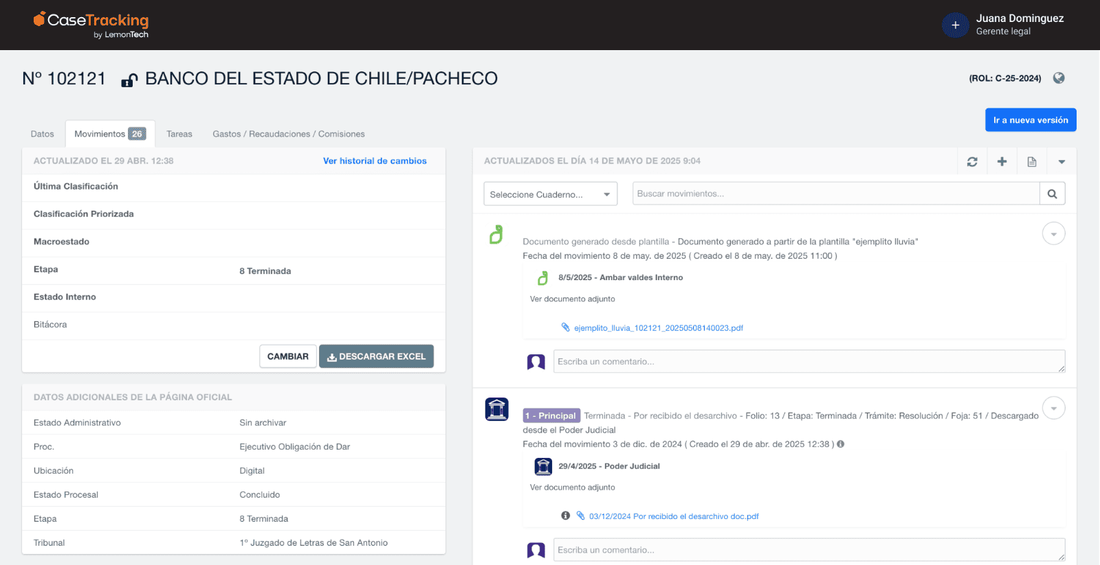 Cada movimiento queda registrado con fecha, usuario, acción y documentos asociados. Esto permite revisar el historial completo de cada causa y cumplir con exigencias de cumplimiento interno o externo.